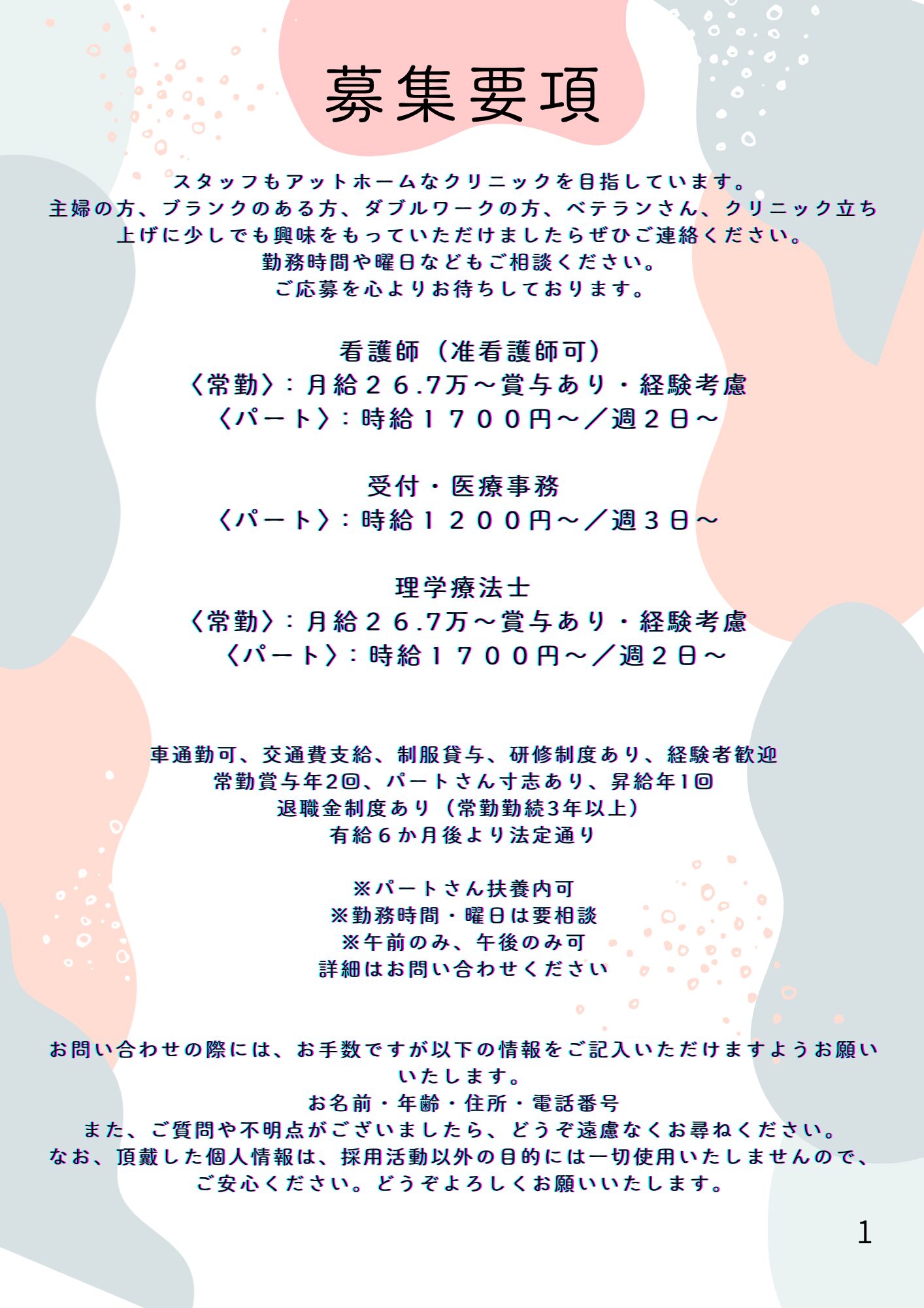 仕事内容: 受付・会計、レセプト業務、電話応対、医師の事務サポートなど。